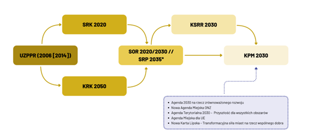 Uwaga: SRK 2020 – Strategia Rozwoju Kraju 2020; KSRR 2030 – Krajowa Strategia Rozwoju regionalnego 2030; UZPPR – Ustawa o Zasadach Prowadzenia Polityki Rozwoju (2006, nowelizacja 2014); SOR 2020/2030 – Strategia na rzecz Odpowiedzialnego Rozwoju; SRP 2035 – Strategia Rozwoju Polski 2035; KRK 2050 – Koncepcja Rozwoju Kraju 2050